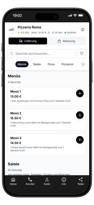 1 kleine Pizza nach Wahl mit Beilagensalat und 1 Getränk 0,33l